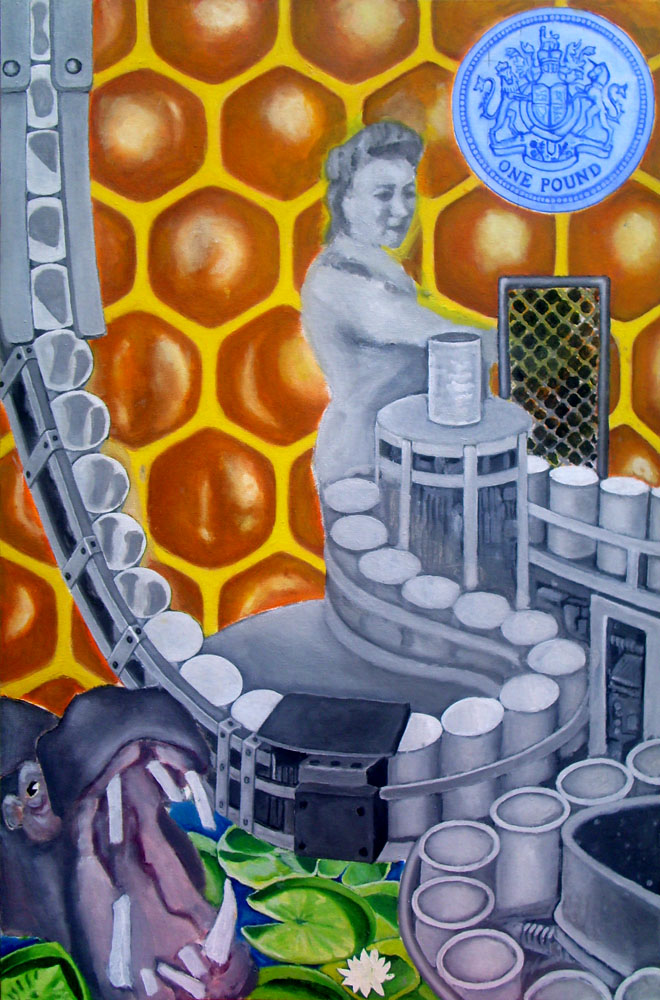 Factory women. My mother used to work in the fettling department of Crown Lynn Potteries – stood eight hours in 30-plus heat then walked heavy home to cook, clean, wash, scrub, starch and iron – maxi-managing our mewling mob of ignorant ingrates. A blue pound coin is what we must have. The hungry hippopotamus had swallowed me whole in recurring nightmares throughout my childhood – although I am not a committed surrealist. Honeycomb beeswax has to be one of the loveliest things – golden sweetness in the truest mathematic configuration.
