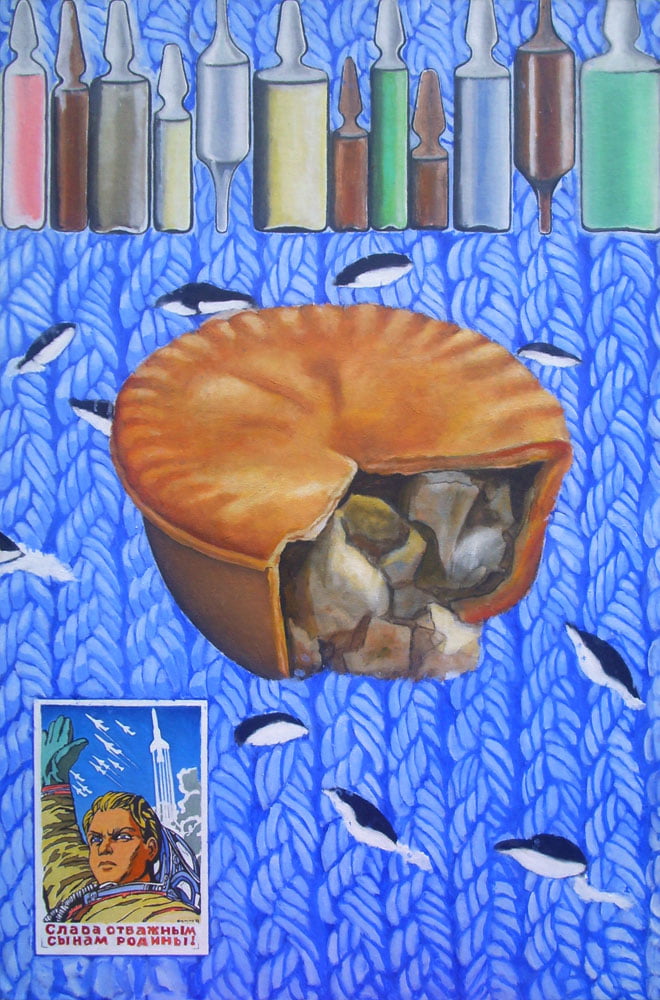 Is the only truly New Zealand-themed painting in the series; with phials of pseudo-opiates, the old meat pie, homespun knitting, rockets into space. Maybe not that last one.