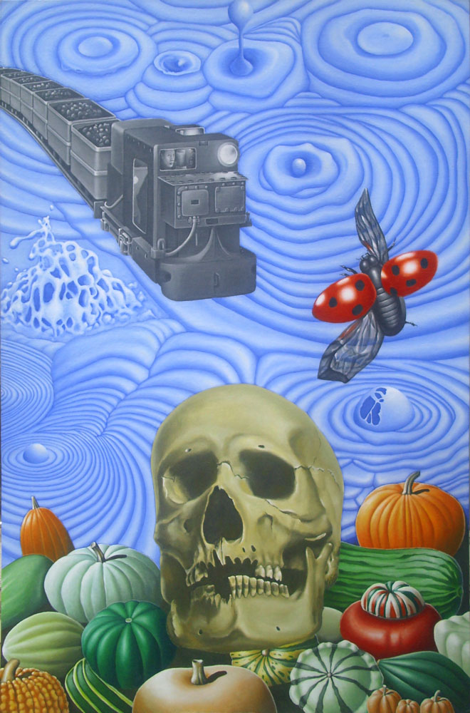 In the 1960s when the telly went down, as it often did, they used to show 'interludes' to keep us in our seats: wheat fields in the wind, a potter throwing clay, a Japanese man drawing sumi-e pine cones, boiling mud from Rotorua – my favourite was the bow of an ice-breaker sailing ship cutting through the ice; one time getting stuck and having to reverse… back and forth... in brutal black and white. Everyone complained about them. I was fascinated and have inserted cryptic references of those I can recall into this sly subrealist series.